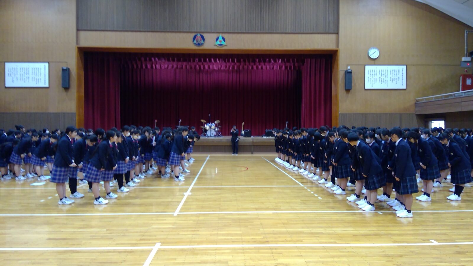 令和8年4月8日に対面式が行われました。2・3年生の先輩の拍手の中、入学したばかりの1年生が少し恥ずかしそうな表情を浮かべながら入場しました。生徒会長から新1年生へ、新1年生から先輩へ挨拶が交わされました。これから1年間このメンバーで、「明るく・楽しく・元気よく」をモットーに、学習、学校行事、生徒会活動に励んでいきます。