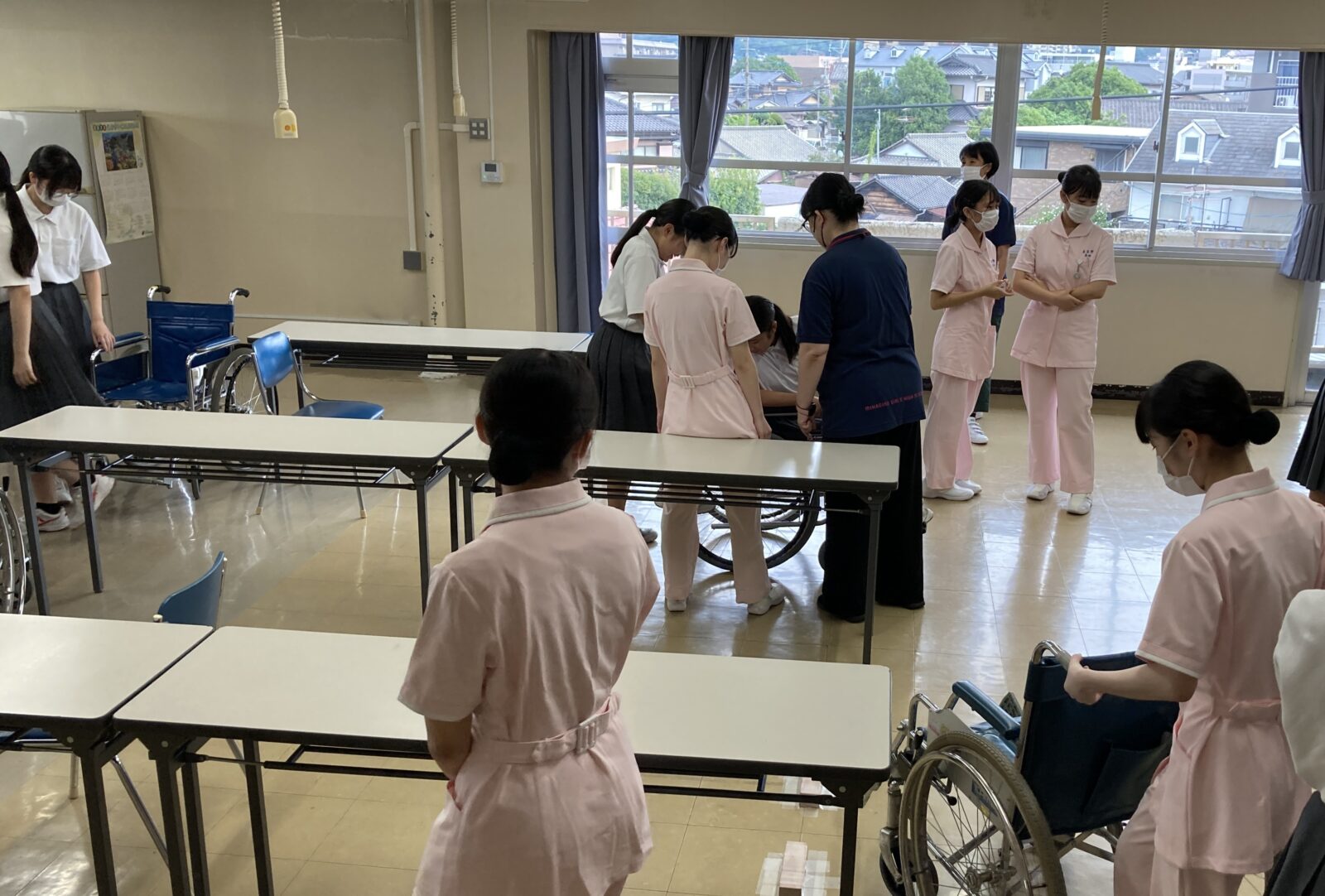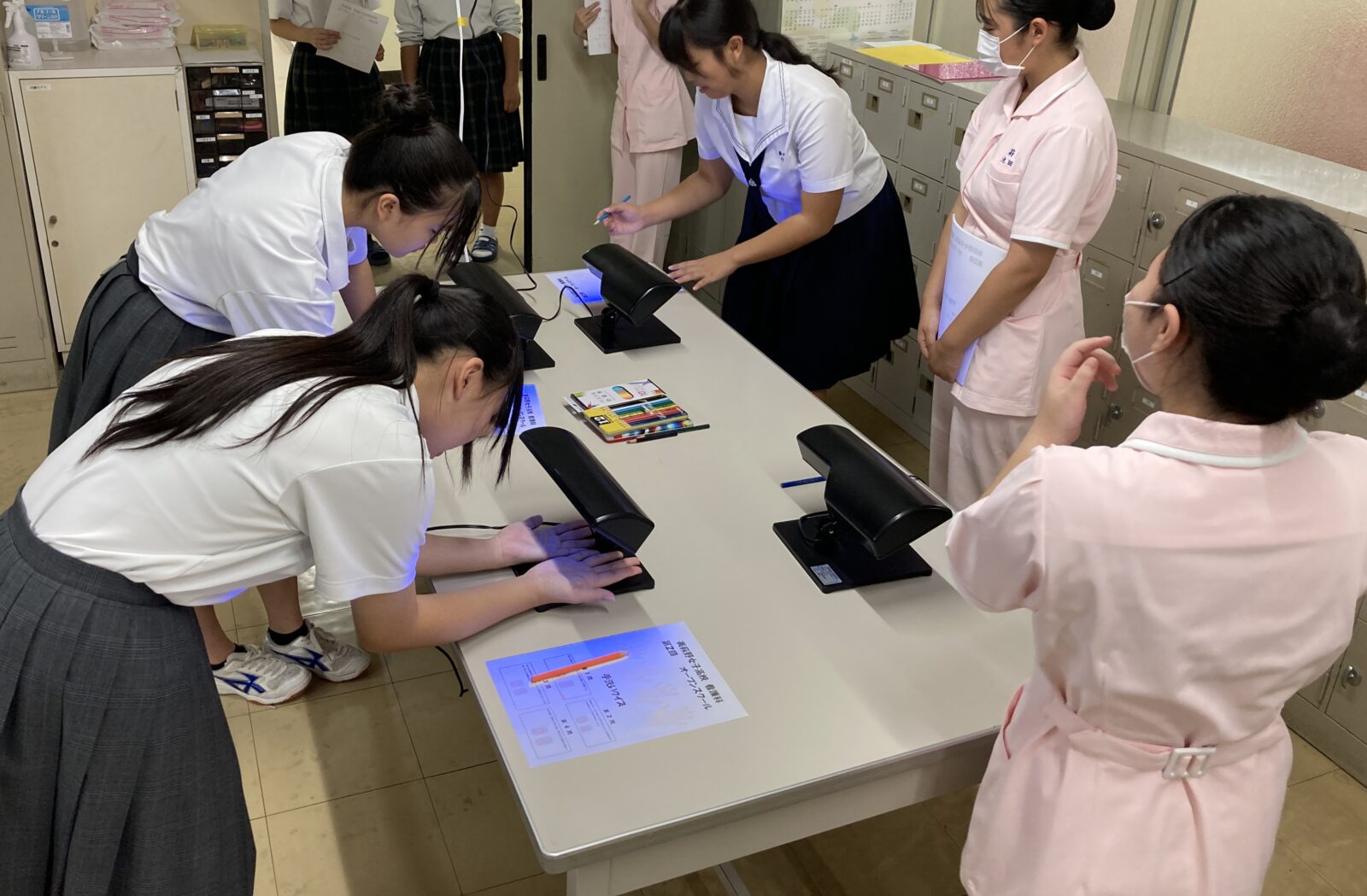 看護科の体験授業。車いす体験と、手洗い後の洗い残しがないかを確認してます。