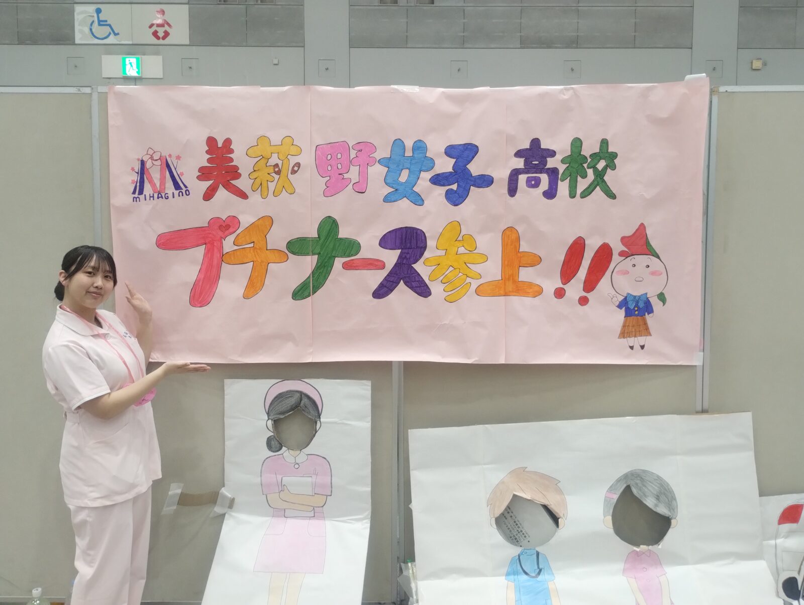 「美萩野プチナース参上‼」と名付けたブースで来場した子供たちの身長、体重を測り、ネームホルダーを一緒に作った後、生徒が手作りしたフォトパネルを使って記念撮影を行いました。